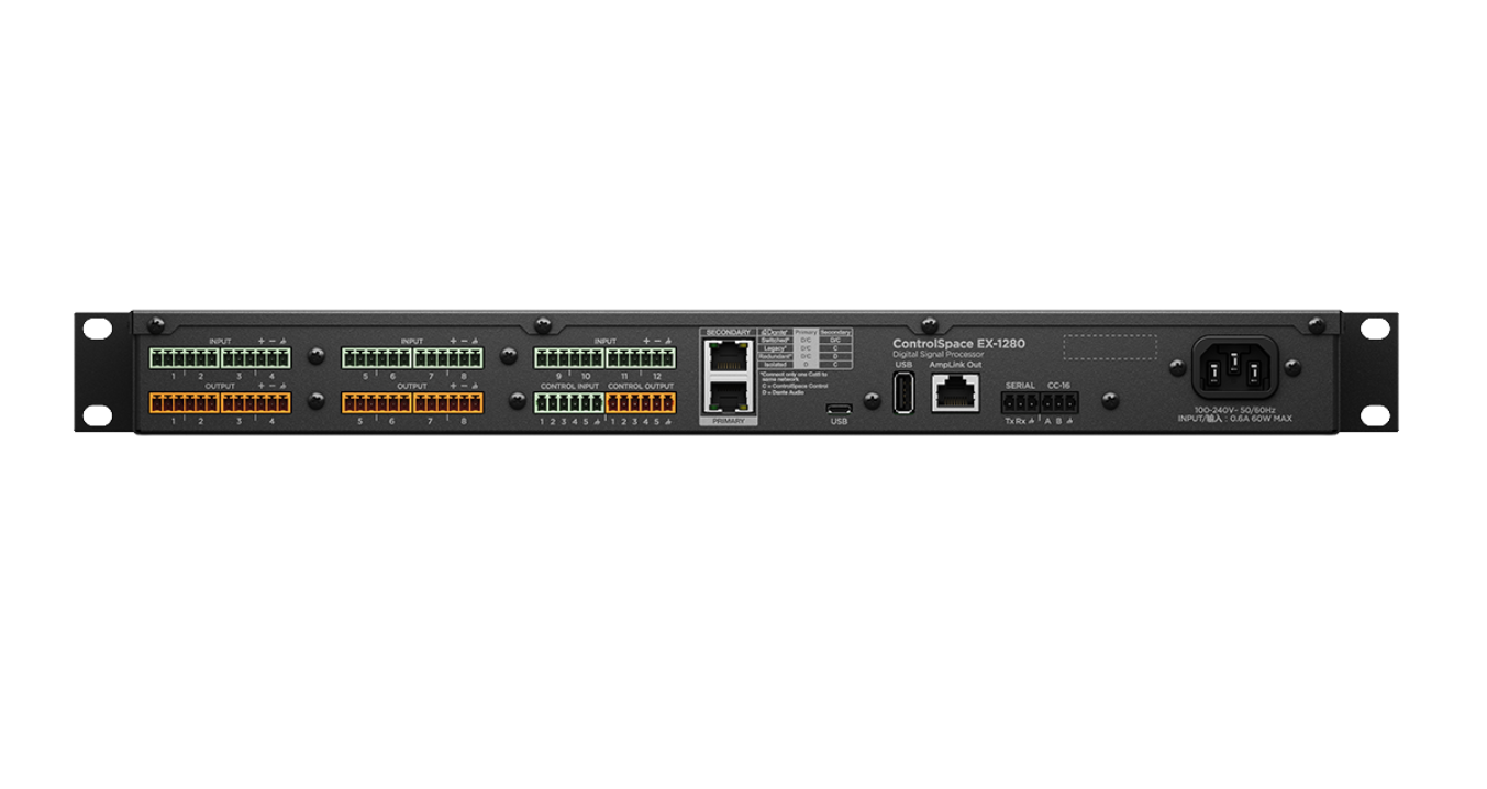 ● Dante 音頻網絡支持 64 x 64 音頻通道,可連接其他啟用 Dante 的產品(包括 Dante 麥克風、功放、混音器和終端)。