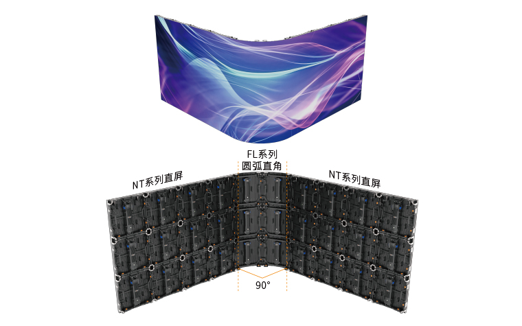 ⑤ 完美圓弧直角,轉角半徑更小:將FL系列2列箱體的角度調整成-45°后連接在一起,即可打造出90°圓弧直角,兩側建議拼接NT系列直屏,以節約購屏成本。當與NT系列互拼時,只需向互拼屏發送一個配置文件即可,互拼屏顯示一致性效果更佳。