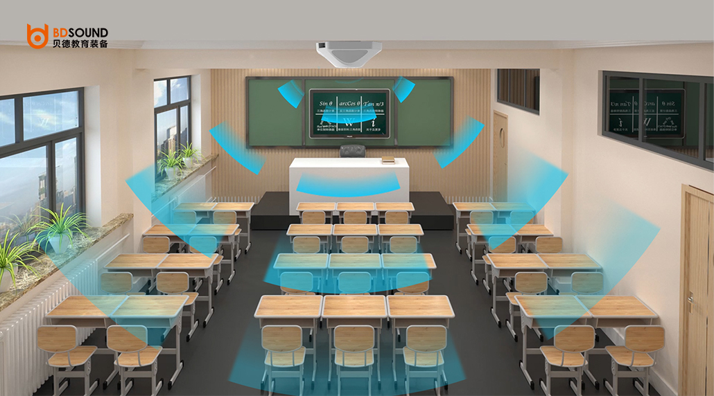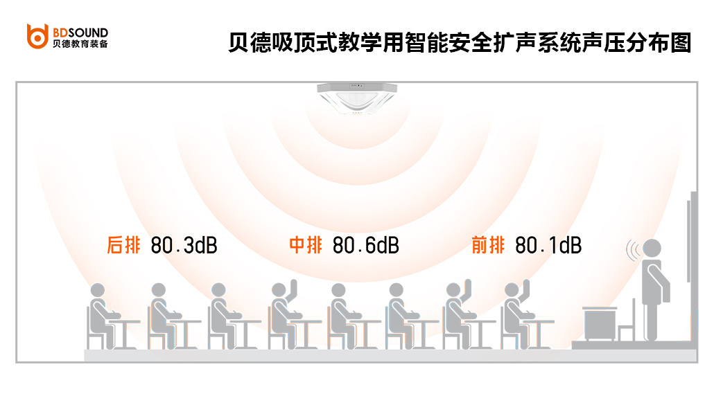 ● 均勻的聲場分布:聲頻360°等聲壓均勻覆蓋每個角落教室內各個位置的聲壓差值在4dB以內;